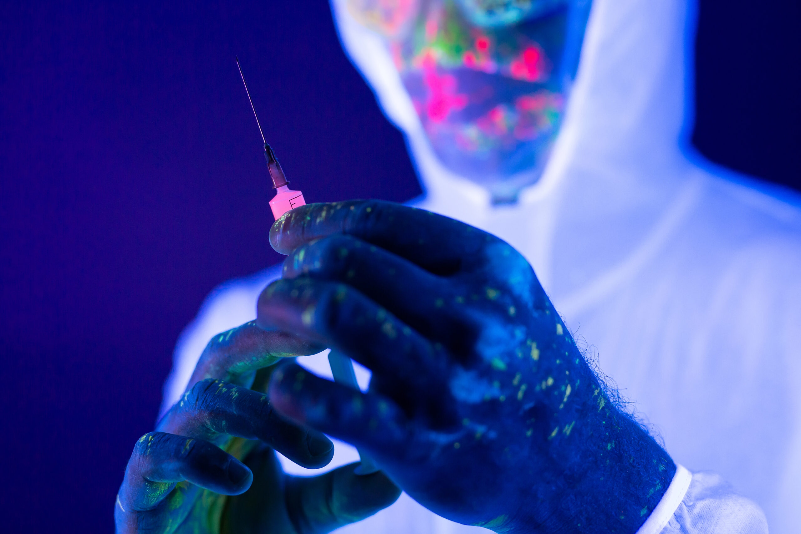 A doctor in an ultraviolet neon light holds a coronavirus vaccine in his hands.
