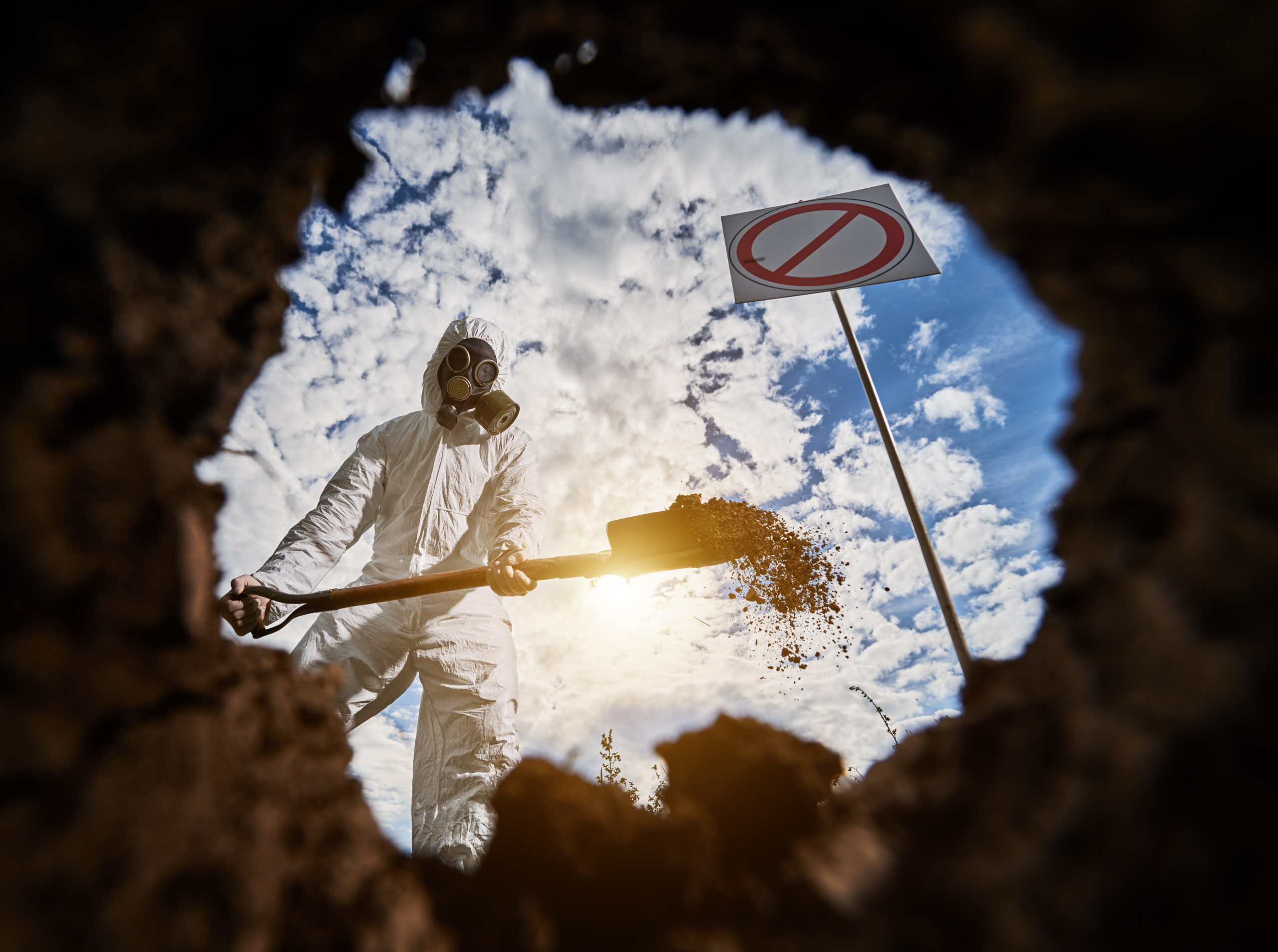 View from inside pit of male scientist digging damaged soil doing research expertise work on infected area, ecologist in overalls analyzing condition of flora during biological experiment