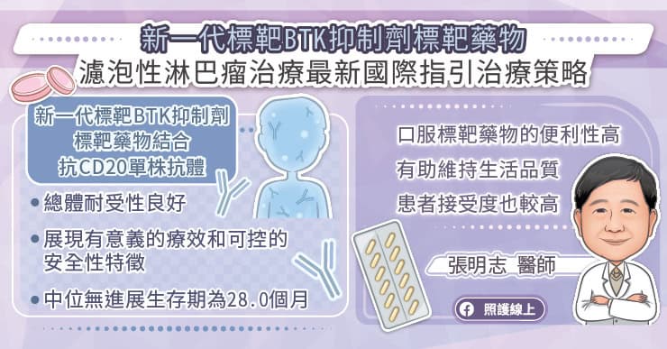 「新一代口服標靶 BTK 抑制劑結合抗 CD20 單株抗體確實解決了部分過去化學治療難以克服的問題。」張明志醫師說,「傳統化學治療通常是針對快速分裂的細胞,對於濾泡性淋巴瘤(FL)這類惰性的腫瘤效果較差,而且化學治療會對腸胃道、骨髓造成較明顯的副作用。BTK 抑制劑標靶藥物能夠針對 B 細胞發揮作用,促使 B 細胞淋巴瘤凋亡,有助發揮治療成效,维持患者生活品質。」