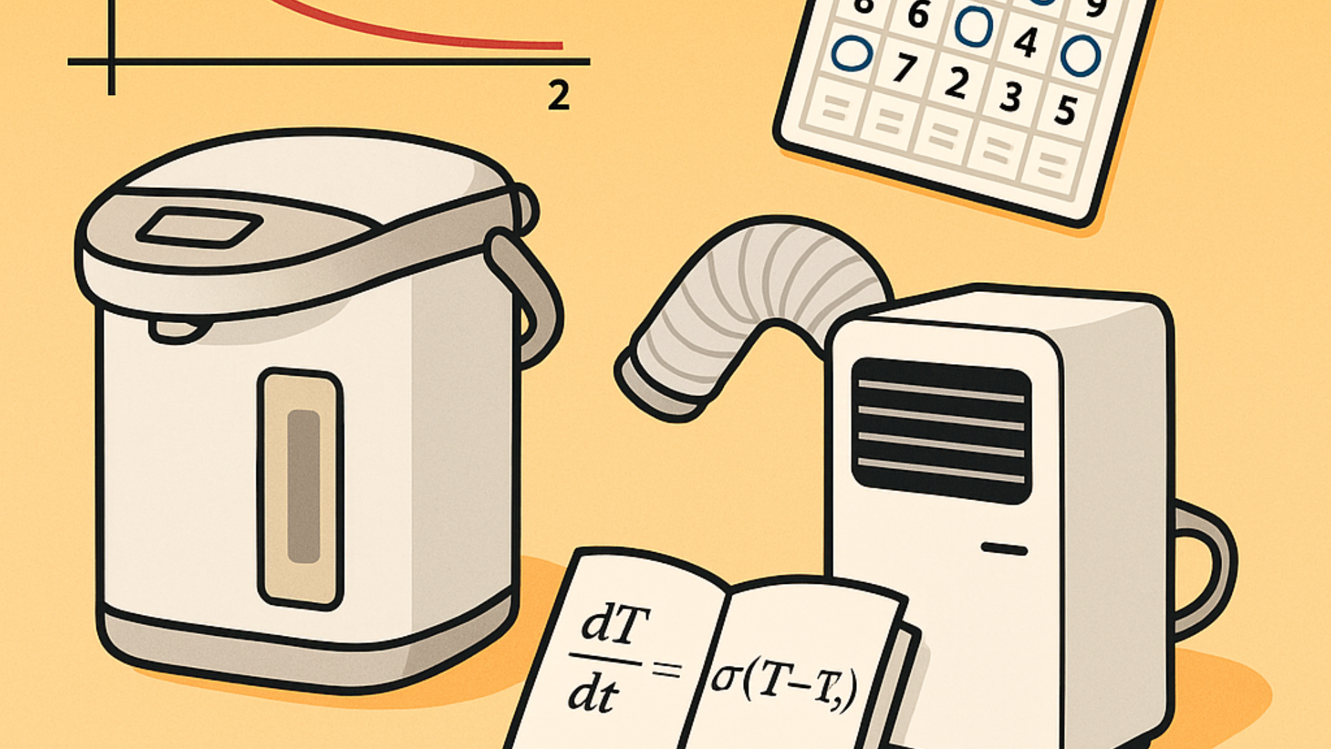 (註一)只要透過基本微積分就可以導出來。熱水瓶的溫度(T)下降速率應該正比於散熱係數(σ)及裡外溫差(T-To):