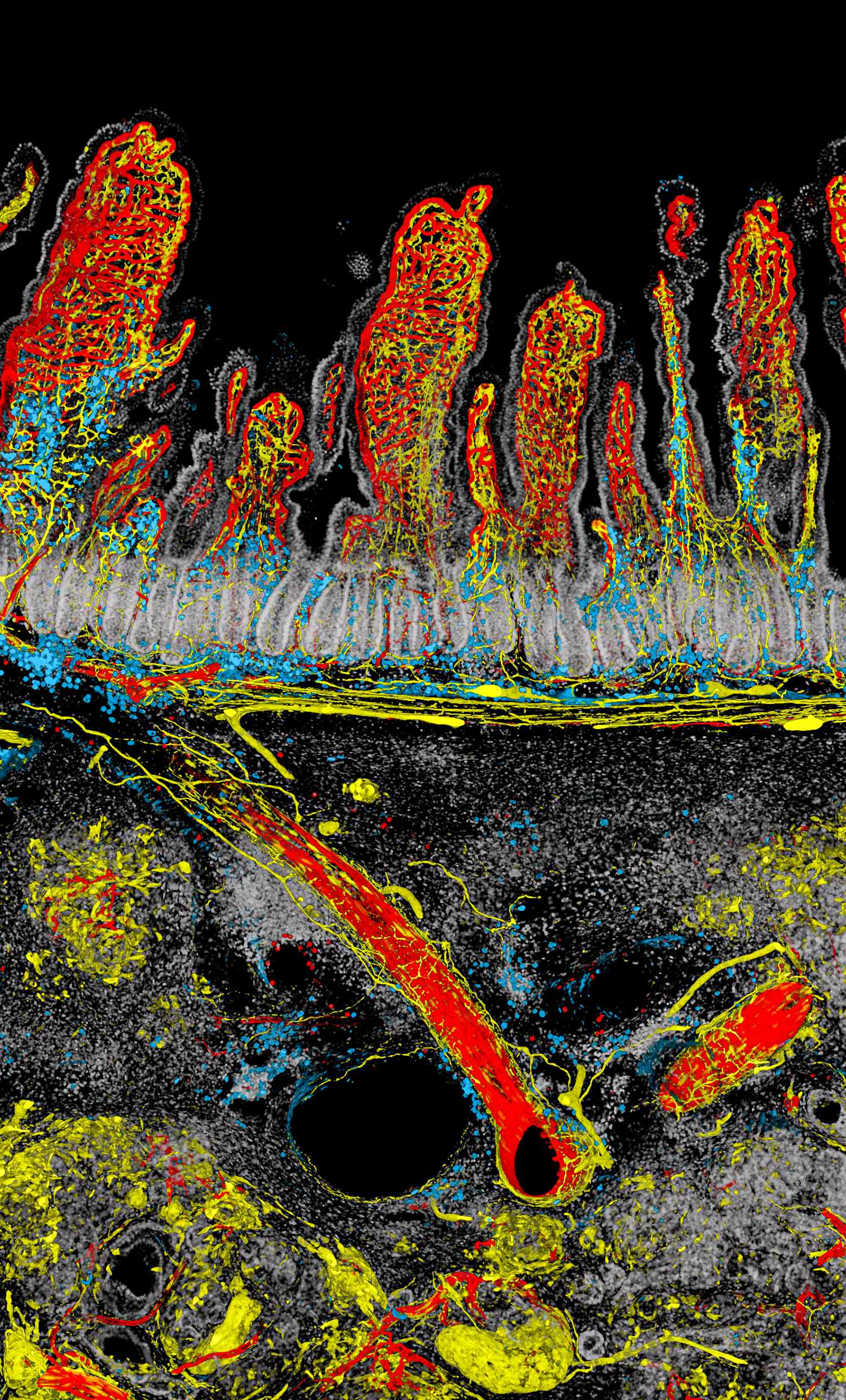 畫面中以腫瘤與腸道的交界處作為分割,上方為十二指腸的腸絨毛血管和神經網絡,下方則是侵襲的胰臟癌腫瘤,呈現出生命與疾病在邊界對峙的氛圍