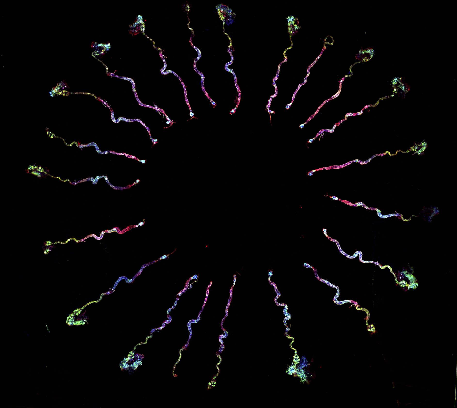 排列成環狀的果蠅腸道,除了是讓玻片中承載的樣本最大化,他表示也想看整段腸道不同區段之間的變化。至於影像中的顏色漸層,反映的是果蠅腸道內本身不同腸道細胞的功能分佈以及對氧化壓力(ROS)的不同反應。