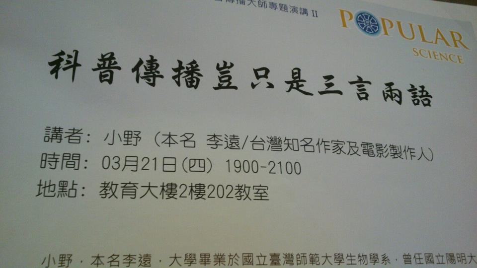 昨晚(3/21)在國立台灣師範大學教育大樓舉辦的一場演講,深深的感動了我,講者是知名作家小野,演講中他以豐富的創作與生活經驗,分享給對科普有興趣的青年學子們,我雖然不是青年學子,但一看到這個講題,就覺得自己非聽不可。小野先生並未授權我完全引述他的話語,而我也沒進行錄音,所以接下來我以一位報導者的角色來敘述演講中我記錄下的重點,以及我心中的感動。當然,記錄若有錯誤,也歡迎小野老師、在場的聽眾指正。