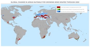 葡萄酒2050年的產地預測:紅色地區將不再適合葡萄生長,綠色地區可以繼續種植,藍色地區則是可能的新興葡萄酒產區。(圖片來源: Conservation International)