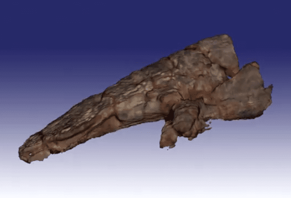 這個世界最古老恐龍胚胎的脊椎骨,長度 5.12 mm,中央部份直徑 2.1 mm;在骨頭旁邊的紅塊為 0.5 mm的參考標誌;用NextEngine 3D Scanner HD掃描很(太)小,花了大約兩個禮拜;樣本採集於2010年3月,發現該化石點是個世界最古老恐龍孵育場所;正在進行國際兩岸合作科研計畫;本視訊短片,也以X, Y, 和Z軸的旋轉展示。