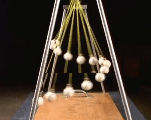 這影片把一群不同擺長的單擺放在一起,提高後同時放下,由側面來觀察這樣的系統會有什麼樣的運動。影片中可以看出幾種模式,一開始像是舞龍,由短的單擺帶領著整體擺動,然後開始出現交錯線,好像分成幾群在擺動,然後變成兩群交叉擺,接著長的單擺變成領頭擺動的那端,然後又恢復成同時擺,接著又重複整個過程!