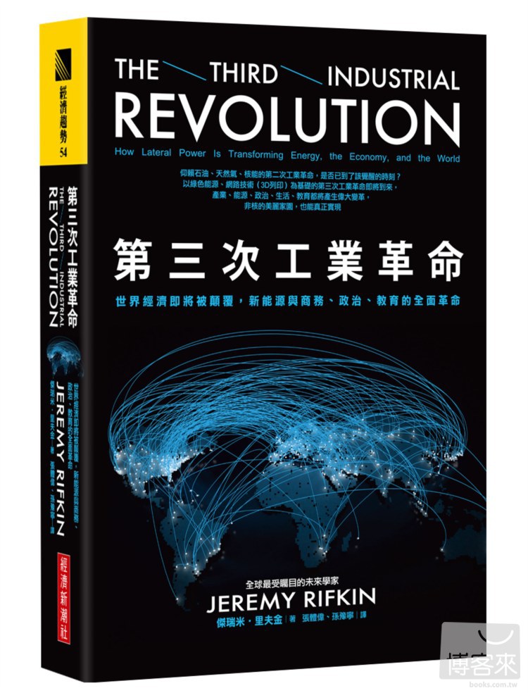 《第三次工業革命》作者傑瑞米.里夫金(Jeremy Rifkin)是著名經濟學家和未來學家、「第三次工業革命」概念的創立者、知名的經濟學家及社會評論家,目前擔任歐盟執委會與歐洲議會的顧問。他在這本《第三次工業革命》中闡述,人類已經歷經了兩次工業革命,每一次的工業革命,都是新的能源與新的資訊通訊科技結合之下而產生的,這次也不例外。第三次工業革命要把每一棟建築物變成微型發電站,可以自行生產出能源。