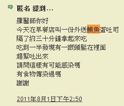 A:你這樣回答就會被說汙名化鮪魚蛋了,還是得耐住性子說明這個病毒不會透過食物傳染。