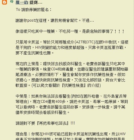 在另一則詢問停藥的留言中,感染HIV的學生為準備考試自行終止影響專注力的西寧,只服用卡貝滋,這在科學面是不可接受的。結合多重藥物的治療源自何大一博士的雞尾酒療法[6],單方面停止其中一種藥物將增加病毒突變、產生抗藥性的機會。為解釋這個科學概念,羅醫師回覆如下: