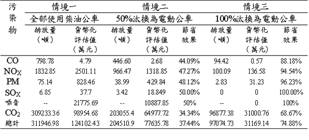 就環保效益而言,現行柴油巴士本身的汙染排放量約等於四十台小轎車的排放量,換算為貨幣,每輛柴油公車的外部成本約為三十三萬台幣,乘上平均使用年限十二年,每台柴油公車將產生近四百萬的外部成本;若以電動公車替代之,各項節省效果如下:[4]
