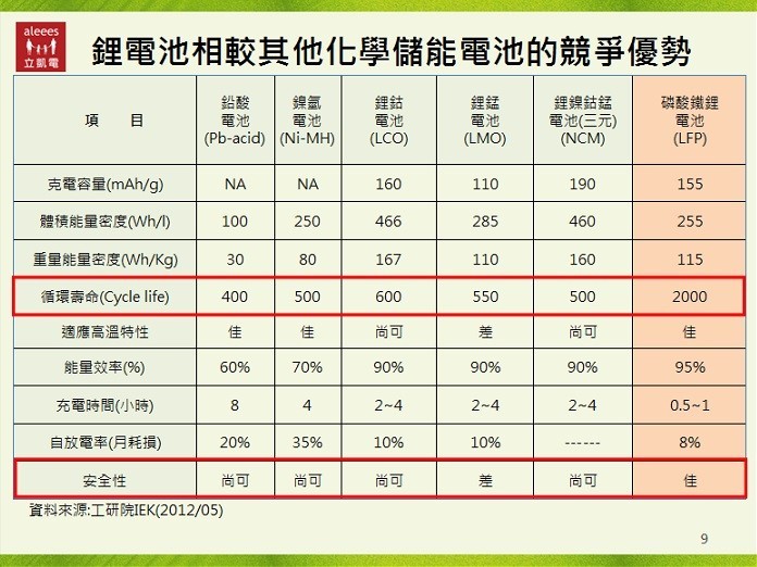 做為電池材料,磷酸鐵鋰被認為比一般鋰電池、鉛酸電池更具競爭力的原因有二: