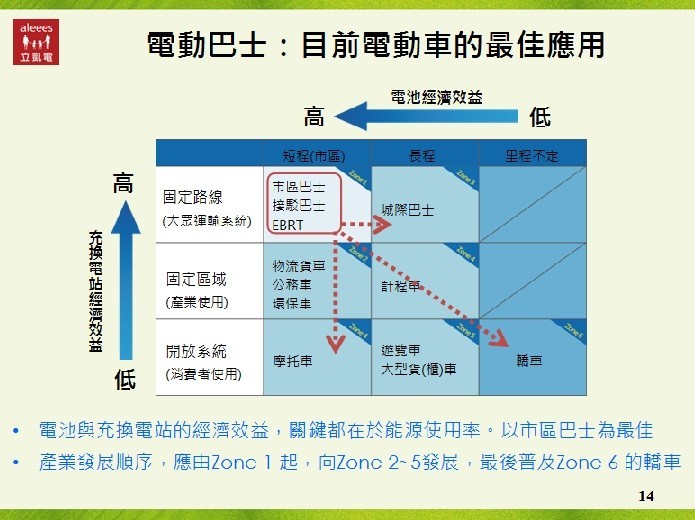就經濟效益而言,以「產業發展策略」的觀點分析,巴士因路程短且起步煞車頻繁,使用電池馬達較柴油引擎的經濟效益高,又因屬於固定路線的大眾運輸網,使用充換電站的經濟效益亦高,會是推廣電動載具良好的首要標的;若能藉由電動巴士的普及帶動充換電站的增設,後續將可推廣至距離較長、路線為固定區域的物流業貨車、公務車、環保車,最終再將電動車普及至數量最多的一般轎車。