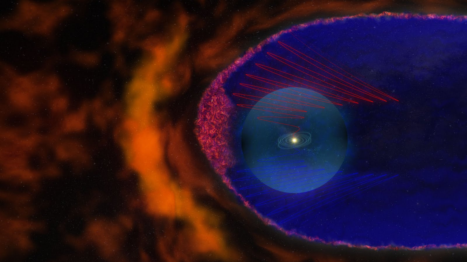 「太陽的磁場一直延伸到太陽系的邊緣區域」Opher解釋說:「由於太陽的自轉,使得太陽磁場扭曲皺褶如芭蕾舞裙,隨著離開太陽越來越遠,這些皺褶都疊合起來了,現在航海家就在這裡。」