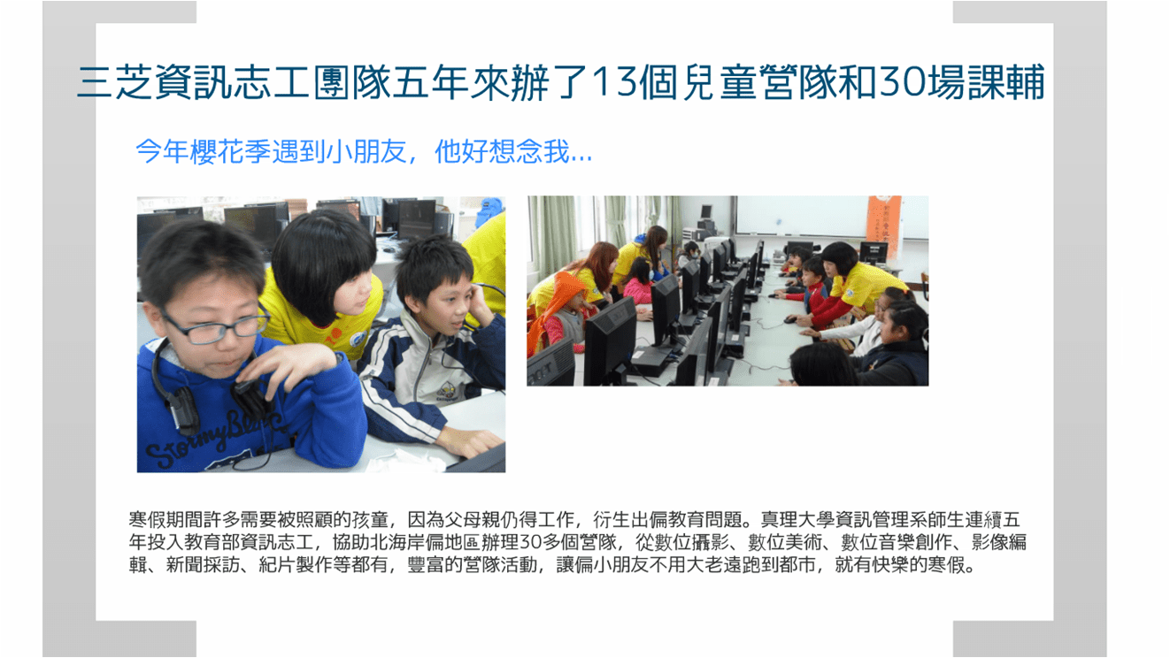在三芝當地李沿儒老師團隊關注的不僅是茭白筍,還有當地國小學童的教育問題。在這五年來,三芝資訊志工團隊舉辦了十三場兒童營隊與三十場課輔,營隊也是不斷的求新求變、更換主題,像數位攝影、新聞採訪、紀錄片製作等等。偏鄉兒童的教育問題也需要「品牌曝光」,讓更多人關注一起努力。