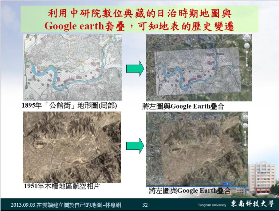 地景地貌的改變可以在不同時代的地圖中被紀錄下來;相同的一張地圖,在不同人的解讀下意義差別可以極大,林惠娟老師表示這是因為背景知識,歷史理解、生活記憶的不同所造成。中研院人文社科研究中心、以及台灣圖書館的館藏地圖,都有供民眾數位下載,每個人都可以透過自己的電腦了解自家附近的地形景貌變化,深化自己對於家鄉土地的了解與情感記憶。