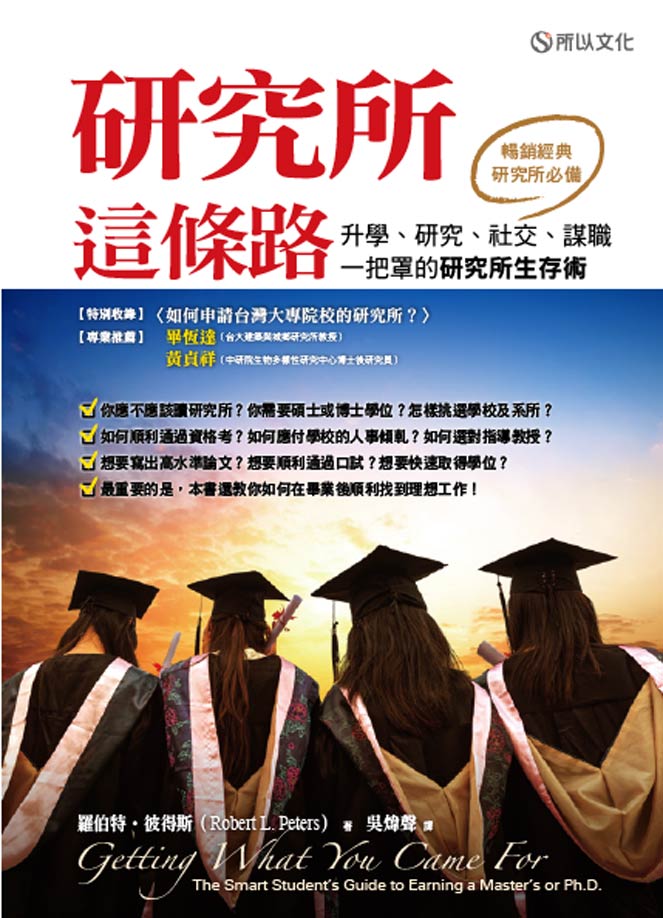 這本《研究所這條路》無法教你如何好好地做研究和在頂尖期刊發表論文,因為那是你的指導教授的責任。然而,它能告訴你,該如何選擇適合的好教授,以及在整個求學過程中,避免犯下經驗不足所會犯的通病,這讓你在摸索和嘗試錯誤中省下許多寶貴的時間和精力,讓你更早進入狀況為前途奮戰,並且更充實、有效率和愉快地完成你人生中最後一次當學生的經歷!