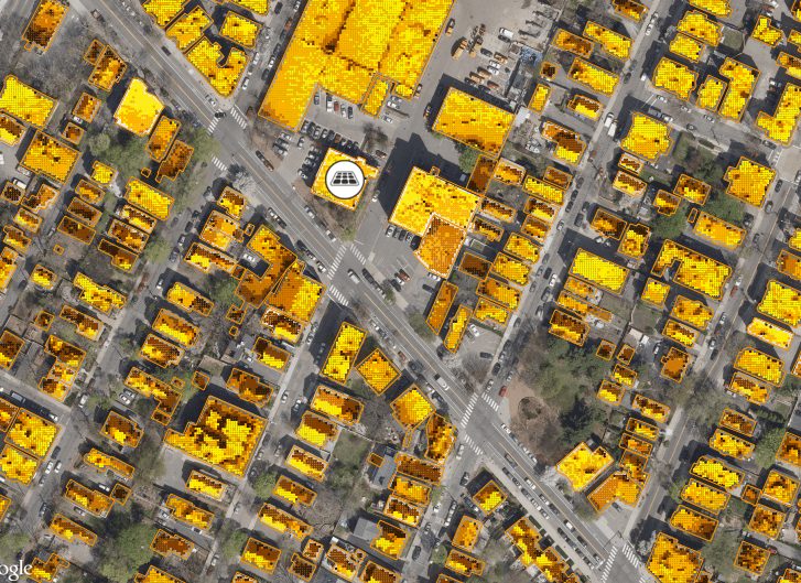 地圖上以各色漸層呈現太陽能發電潛力,深棕色意指毫無潛力、橘色代表良好、鮮黃代表極佳,民眾皆可在網路上瀏覽這張相當方便的地圖,選取劍橋地區任一建築,即可立即計算個人化建置成本、預估發電量與減碳量,這項技術已可運用在世界各地城鎮。