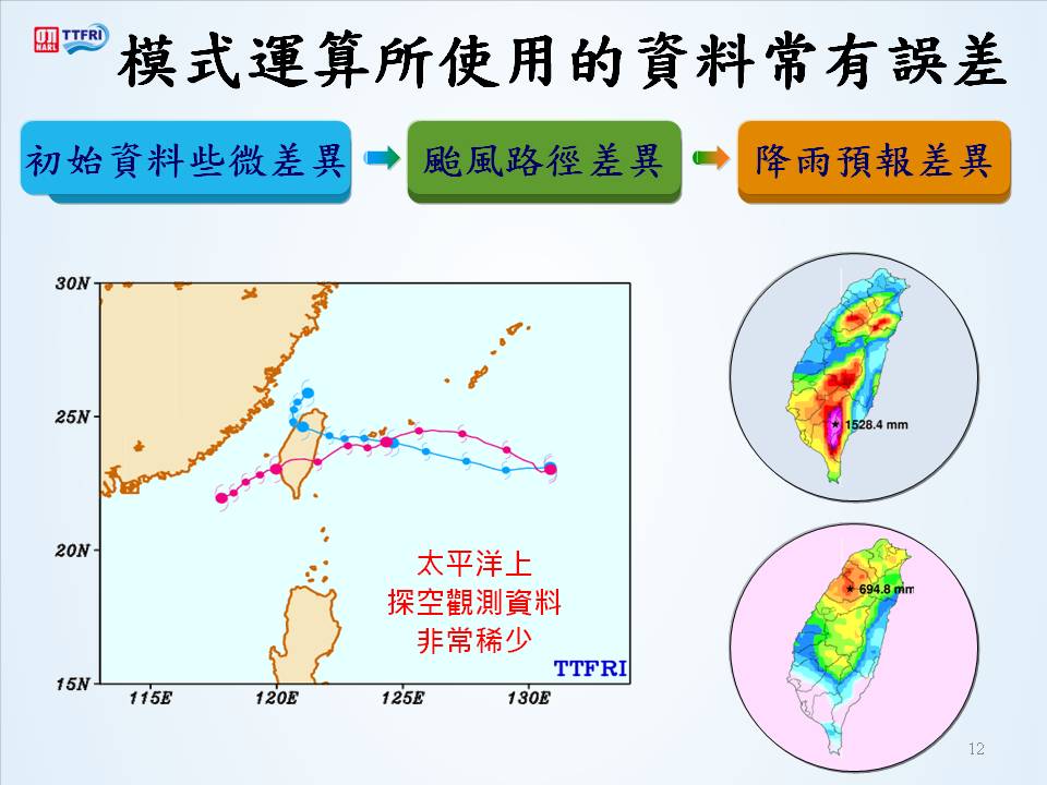 準確的颱風降水預報取決於兩點:颱風路徑預報與颱風降水結構預報。目前台灣只有四個觀測大氣垂直狀況的測站,分別位於板橋、台南、墾丁、花蓮;大海台灣外海的一大片海洋上空的資料幾乎沒有,偏偏颱風又是在海面發展與移動,且颱風影響台灣時,更大的空間範圍內的大氣狀況亦會造成影響,例如產生共伴效應與西南氣流等。