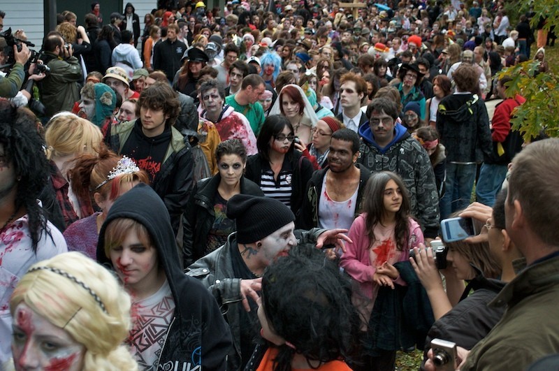 2013年初的時候,倫敦的科學博物館(Science Museum)舉辦了一系列殭屍活動,探討跟殭屍有關的科學,或是殭屍疫情爆發會怎樣,討論殭屍有沒有人權之類的。以下介紹其中一個有趣但沒有血淋淋殭屍的活動。英國埃塞克斯大學的數學家Nikolai Bode和生物數學家Edward Codling,請民眾用滑鼠按鍵控制人的移動方向,目標是成功從一個充滿殭屍的空間中逃離,但是不能碰到殭屍。此研究發現,在時間壓力下人們比較容易選擇從走過的出口離開-即便那個出口被殭屍塞滿-很明顯是個錯誤決定;在發現殭屍太多時,有壓力的人也比較不會重新思考逃跑方向。此研究結果登於2013年八月的Animal Behaviour。