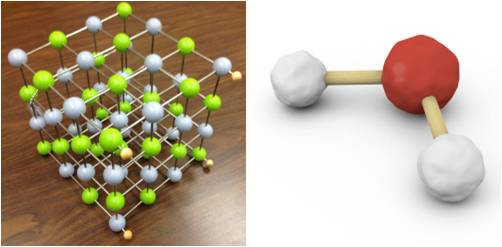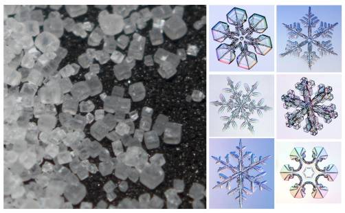物質具有基礎結構這一點,在你觀察某些物體的時候其實就很明顯了。食鹽結晶擁有極為標準的立方對稱;雪花則精準地呈現了六角對稱。許多物質狀態會形成規律的結構,物理學家稱之為「晶格」。晶格實際的形狀和排列方式,依組成的原子性質而定。食鹽結晶是由鈉原子與氯原子交替排列組成的。原子將電子當成鉤子一樣,用來與其他原子連結 (我們化學界的朋友稱之為「價鍵」(valence bond)),而這些鉤子的位置,就會影響原子所組成的分子形狀。鈉原子和氯原子能夠以直線連結,堆疊在一起時自然就形成矩形。