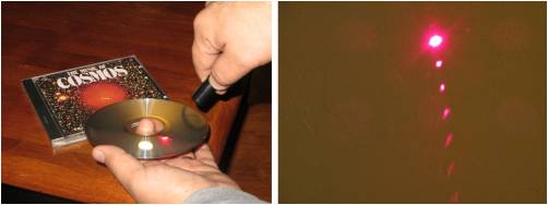 你可以自己在家中用 CD 和雷射筆做做看類似的實驗。如果你把雷射筆照射在 CD 表面,再看看反射在牆上的光,就會看到一排光點,光點的間距會依據 CD 上面燒錄歌曲的軌跡結構而定。