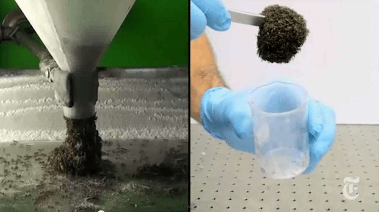 在11月美國物理學會的一場會議上,他們展示了上面的影片中的火蟻。一團火蟻可以像是糖漿一樣從管子中流出來,或是像一顆球一樣被壓下去還會彈回來。他們使用物理實驗用的流變儀精確測量蟻群作為流體的黏度和作為固體在不同壓力下的彈性,也同時發現在不同的狀態下,螞蟻的行為模式不同。