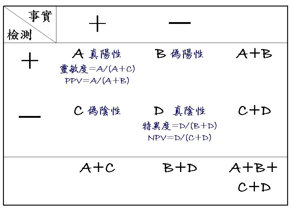 這是一個科學上探討檢測或篩檢的優劣時很常見的表格。如你所見,一般狀況下的事實大概都是二分法,例如這裡討論的『同志』和『直男』,而檢測的結果當然也是『是個同志』或『是個直男』這兩種。因此,事實與檢測所組成的四種可能,分別是『被說是同志的同志』的真陽性(A)、『被說是同志的直男』的偽陽性(B)、『被說是直男的同志』的偽陰性(C)、以及『被說是直男的直男』的真陰性(D)。理想狀況下,一個完美的GAYDAR當然是『同志就同志,直男就直男』,也就是B跟C均為零,A跟D包含所有的案例這樣。可是,除了可以看到雲啊霧啊的MC美江之外這種完美的GAYDAR當然罕見,現有的各種科學檢測也都還辦不到這件事。於是,要知道一個GAYDAR的能力有多強,就要利用這個表格得到更進一步的資訊。