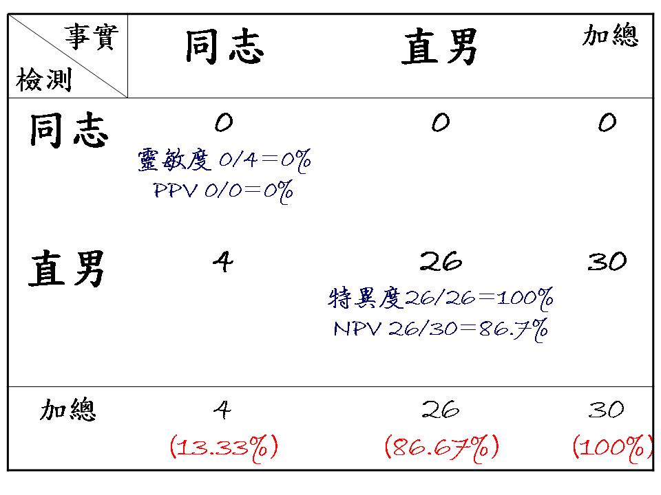 前面提到的檢測GAYDAR的方式,只不過是看受測者的正確率,也就是真陽性和真陰性的判斷在所有判斷中的比例((A+D)/(A+B+C+D))。但因為今天大家都知道同志的所佔的人口比例就是少,所以不是GAYDAR的人就算一路壓寶『直男』,在多數的志願者可能都是直男的狀況下還是會有相當好的正確率,於是就成了充數的濫竽。以本例來說,一路『直男』到底的正確率是86.7%,以先前的檢定來看絕對是個顯著GAYDAR。可是一旦把結果畫成這個表,就可以清楚的看出來:雖然一路壓寶直男的特異度很高(100%),但是根本沒有靈敏度跟陽性預測值可言(0%),而且陰性預測值也可以發現根本和直男的人口比例一樣,表示根本就是瞎貓碰上死耗子。所以,大概就可以判定這個號稱有GAYDAR的人是濫竽充數裝裝樣子而已。
