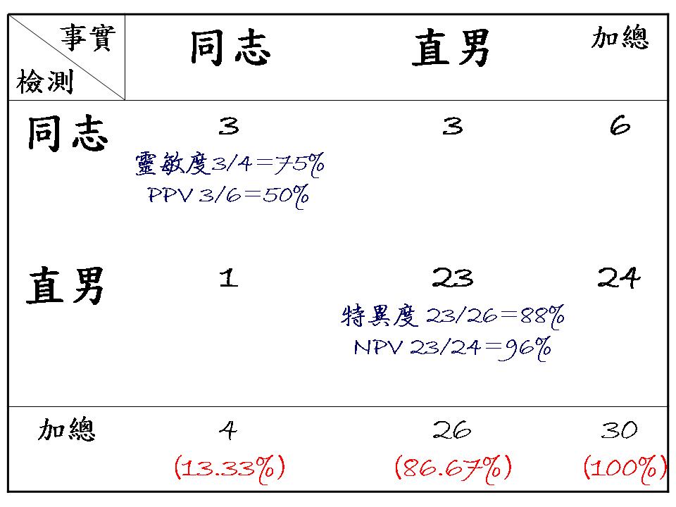 你可以看出來,雖然這個人的整體正確率也是26/30=86.7%,但是他的靈敏度可是紮實的75%,陽性預測值PPV也有五成,雖然特異度比起前一個一路直男的騙子稍低,但總還是將近九成的88%,而且陰性預測值96%也還是比前一個高。根據這些數據,我們大概就可以說:這是個貨真價實的GAYDAR,真的有能力能夠根據照片就判斷出一個人是同志或直男,不過這個GAYDAR『鐵口直斷是同志』的可信度只有五成,遠不如『鐵口直斷是直男』超過九成五的可信度高就是了。白話的意思就是說,他如果說某個人是同志,那可以參考一下,但是當他說某個人是直男那就幾乎可以拍胸脯保證了。