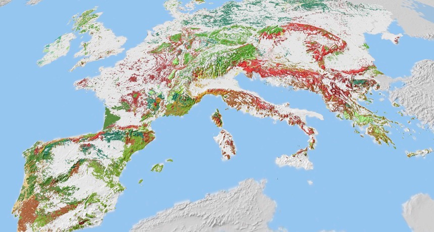 歐洲的森林樹種地圖,綠色代表針葉林的分布,如松樹;紅色與褐色則是櫸樹、櫟木與其他闊葉樹種。此圖顯示歐洲各地森林由不同物種組成,固需要因地制宜的森林政策來延長森林的碳匯功能。(圖片來源:Image courtesy of European Forest Institute)