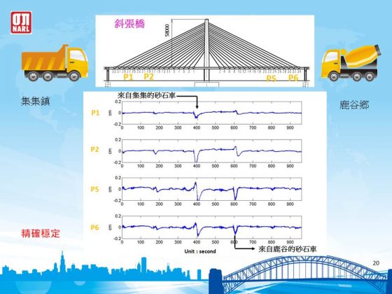 光纖監測系統能長時間監測橋體受到外力產生的震動,圖為重型車輛通過南投集鹿大橋時的監測數據。(圖片來源:國家地震工程研究中心,李政寬提供)