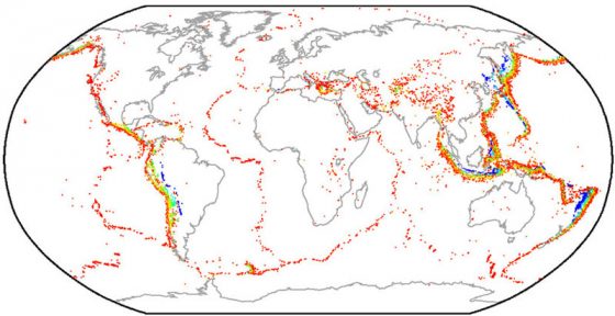 超過兩萬筆的地震資料被標註於世界地圖上,了解過去能讓我們對於未來的地震有更多認識。(圖片來源:International Seismic Centre)
