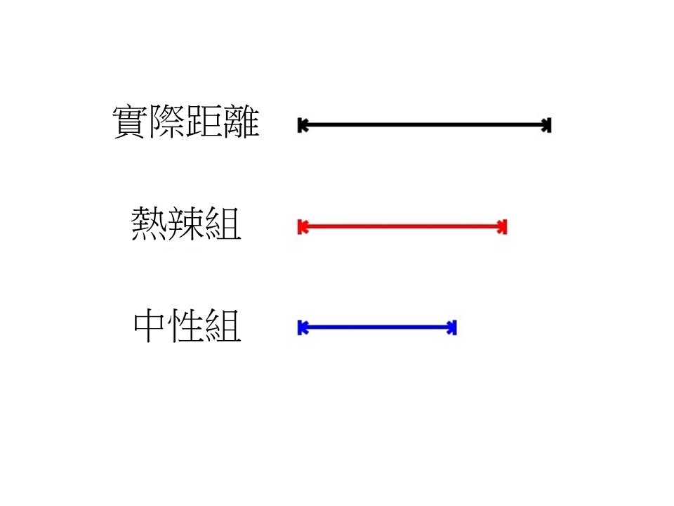 第一個實驗是一個簡單的時間知覺準確性的測試,要求參與者在看過一些圖片之後,對從現在到未來某個時間點的實際距離進行評估。實驗共招募了59名自稱是異性戀的男性,他們被分成了熱辣組和中性組,其中熱辣組得到的圖片包含明確的性訊息(例如像是維多利亞的秘密官網裡的內衣圖片),中性組的圖片則是普通的物體。結果發現,當評估時間的長短時,所有參與者的估計結果都比實際上的時間還短,但是熱辣組估計的時間比起中性組來得長(圖一)。對同樣長的時間而言,雖然大家都沒法做出準確的判斷,但相對而言,性訊息會使人們覺得這段時間更長。回想一下自己或朋友逝去的遠距離戀情。說好的即便分隔兩地還是會等待和希望呢?說好的熬過這兩年就重新在一起永不分離呢?說好的要一起步入婚姻的殿堂呢?最後怎麼就成了相忘於江湖?所以,遠距離戀情最後只剩下一句『我等不到那遙遙無期的未來了』。其實是因為面對身邊的誘惑,你覺得未來變遠了,覺得自己不想等了而已。至於具體是什麼樣的誘惑,就不要深究了吧……