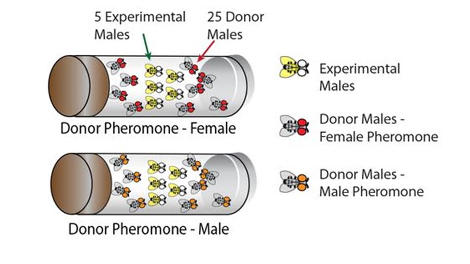 接觸到雌性費洛蒙的雄果蠅身體裡有較少的脂肪儲存,而且更不耐饑餓,還有壽命比接觸雄性費洛蒙的正常雄性更短命!這些反效果,在雌性費洛蒙被移除後,就消失了!接著,他們利用Or83b嗅覺受器基因突變的雄果蠅來進行相同的實驗,結果發現效果仍相同,顯示嗅覺與性費洛蒙的接收無關。可是轉基因果蠅的味覺受器基因ppk23無法表現後,雄果蠅在接觸到雌性費洛蒙就不會短命了!那些味覺受器表現在雄果蠅的前腳,當砍斷那些腳上的鎖鏈,雄果蠅不能受到色誘後,生理和壽命就恢復了。這顯示雄果蠅是利用味覺受器來感覺雌性費洛蒙,並且影響了抗壓性以及壽命。
