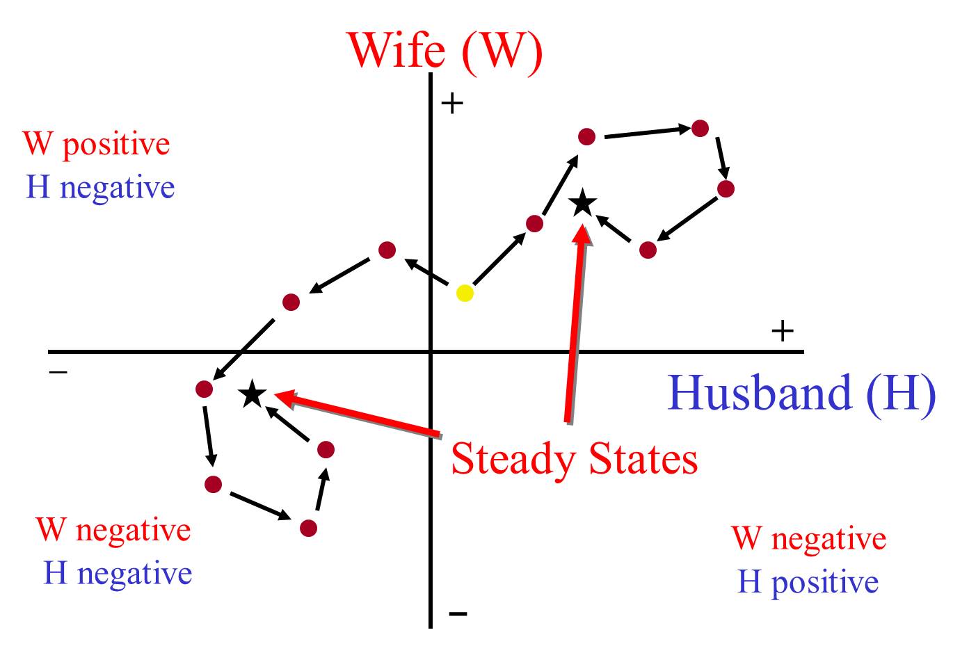 第一象限表示雙方都有好心情,第三象限是雙方都不開心,第二與第四象限則是各有一方開心,一方不悅。在這個例子裡,起始的黃點在第一象限,約莫是出門撿到十元的小確幸程度。接著依據向左走、向右走會出現兩種收斂狀況:往右,互動越來越好,開心過了頭,最後收斂回起始點右上方的星號,表示經過這次對話,雙方都更開心了。但也可能往左,丈夫先不開心,妻子看到丈夫「結屎臉」,好心情受到影響,也皺起眉頭,之後兩人大吵,把該摔的東西摔一摔,稍微冷靜後,收斂在左下角的星號,落在雙方都心情不好的第三象限。