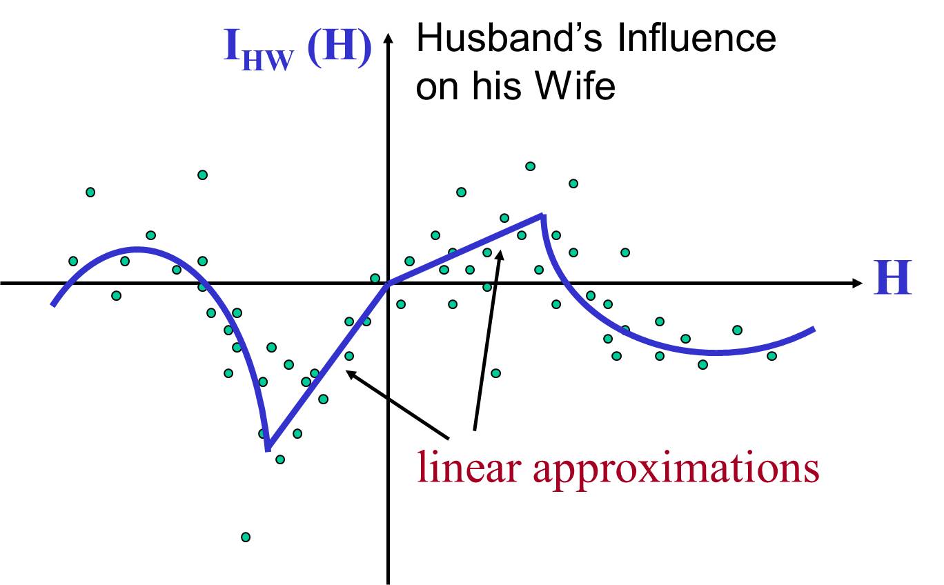 James Murray進一步將影響函式以二段式的線性逼近(piecewise linear)。繼續以上圖為例,當丈夫生氣時,線性逼近的線段斜率大於1,表示妻子會更激動,比丈夫更生氣;當丈夫開心時,線性逼近的線段斜率小於1,妻子比較沒那麼開心。
