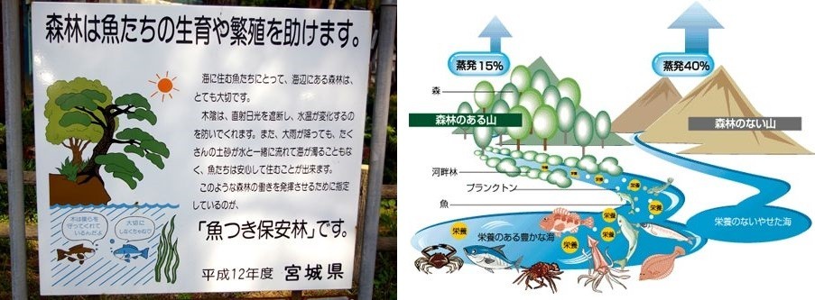 2011年聯合國森林論壇(UNFF)表揚10位首屆國際森林英雄,當中赫然有位生活生產都在海邊的漁民特別受矚目。這是日本宮城縣經營牡蠣養殖場的畠山重篤,被稱為「牡蠣爺爺」,在他自1989年發起「森林是大海的戀人」上山造林活動之後,每年六月氣仙沼灣的漁夫們,都會帶著當地居民及學生一起上山照顧森林。因為他們知道山上森林的自然廢棄有機物,會變成養分進入小溪流,再由河川送往大海,因而使袤廣汪洋有了生命力,人們才得以年年有魚有牡蠣【註1】。