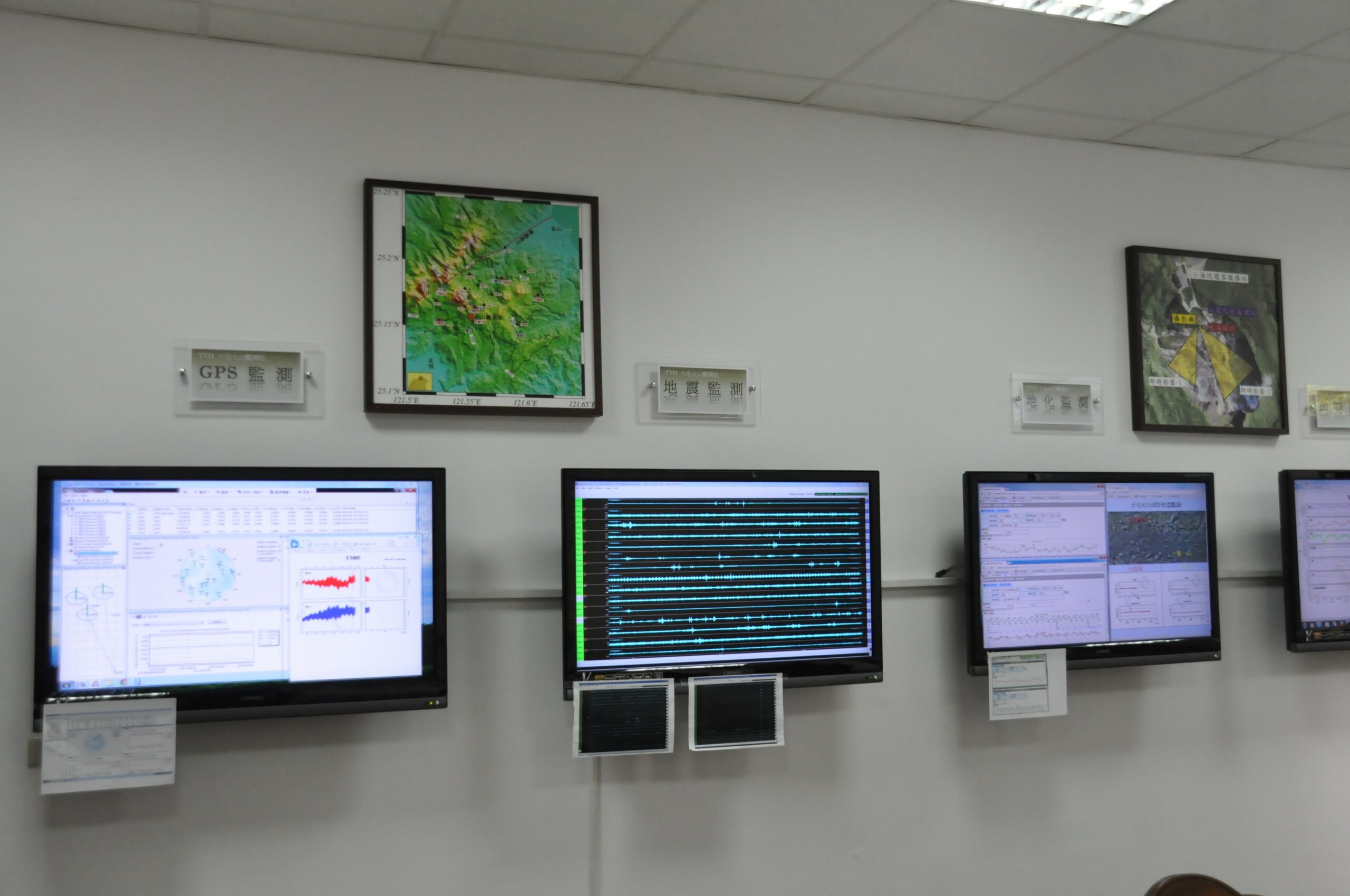 大屯火山觀測站中的即時監測儀器傳回的影像,從左而右分別是大地震量監測、微震監測、地球化學監測,以及即時影像與地磁變化(右邊被裁切處)。(圖片來源:潘昌志)