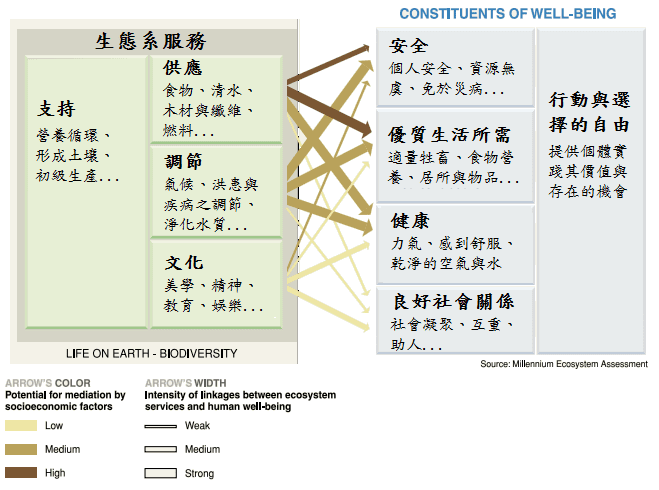 我們可以把這些森林生態系所提供的服務歸納成上面四種:供應(provisioning)、調節(regulating)、支持(supporting)、文化(culture),這是從遠古到現今,我們一直從森林生態系所得到的服務。
