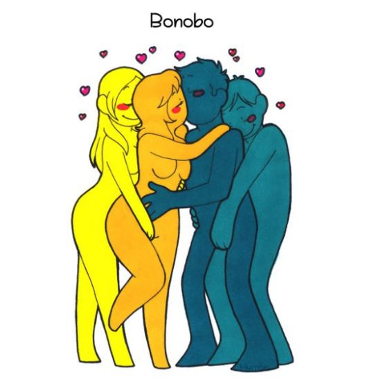 性交對侏儒黑猩猩來說是非常臨時、隨意的,雖然黑猩猩和我們人類一樣有些性愛禁忌,但侏儒黑猩猩可完全沒這回事。任何事情都能以愛之名化解,也因此侏儒黑猩猩的族群是最和平的社會之一。