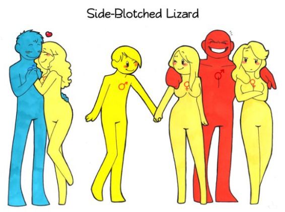 最後,黃色喉部的雄蜥體型最小,外貌乍看之下與雌蜥差不多,而且他們沒有自己的領土。這樣看似相當魯蛇的雄蜥其實有他的優勢,他們會混入橘喉型雄蜥的廣大地盤中,偷偷地與雌蜥搞婚外情。由於橘喉型雄蜥花較多時間在保衛地盤,因此與雌蜥建立的配偶關係較弱,因此黃喉型雄蜥可以趁虛而入,成為男版小三。另外與藍喉型雄蜥配對的雌蜥則因緊密連結而將黃喉型雄蜥拒之門外,不會讓他們有機可趁。