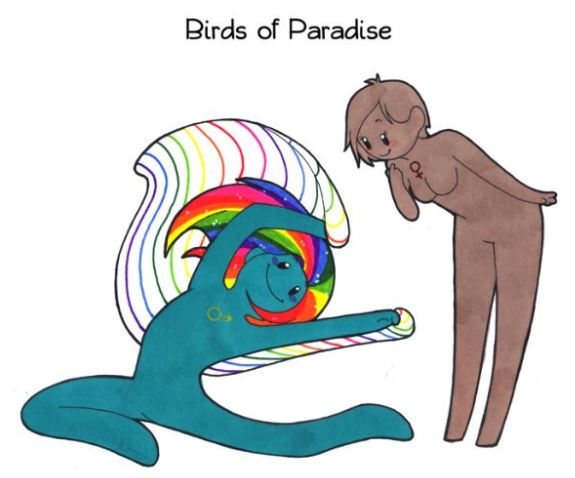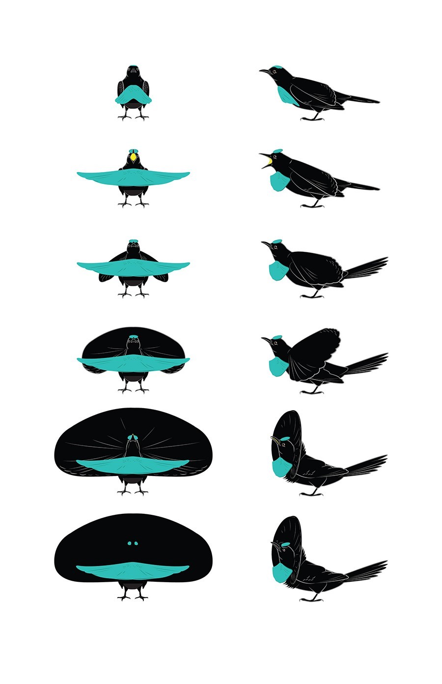 棲息在食物充裕、掠食者不多的森林裡,雄性天堂鳥有許多時間,擺動牠們身上令人嘆為觀止的鳥羽,表演一齣最動人的求偶舞蹈來擄獲雌鳥芳心。在強烈性擇的壓力下,即便沒有雌鳥在附近,牠們的表演慾仍然相當強烈。一旦雌鳥現身,雄鳥便會卯起全身的衝勁,為姑娘們獻上最細緻的舞步。年輕的小夥子們總是經驗不足,牠們會觀察資深熟男(大概就是都敏俊那樣吧)的舞步,作作筆記、學點小撇步,借用熟男的場子來加緊練習,希冀能夠雀屏中選。