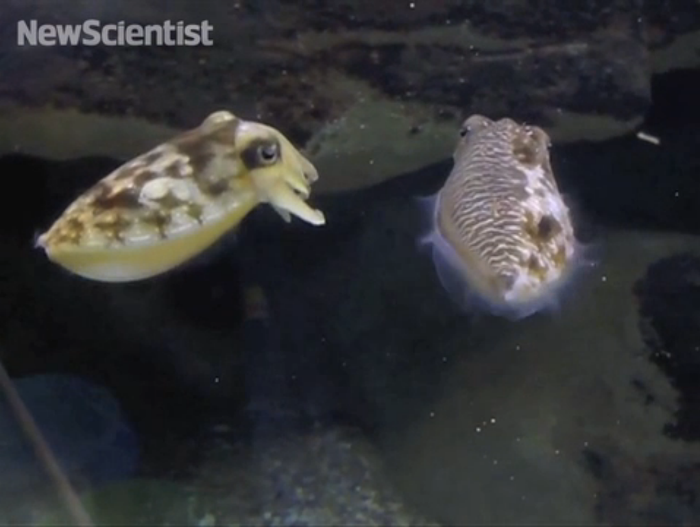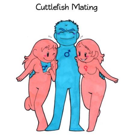 但就像許多女生不喜歡巨石強森反而喜歡美男一樣,這些母烏賊對硬梆梆的肌肉無多餘好感,她們喜歡體型較小、較聰明的公烏賊。但這些體型較小的公烏賊如何接近受到大公烏賊保護的雌性個體呢?非常聰明地,這些小公烏賊假扮成弱女子(雌烏賊的體色樣式)若無其事地靠近並且輕柔地拂過大公烏賊讓他失去戒心,而趁其不注意時就向母烏賊表現出其雄性的象徵,接著便大膽地開始交配。