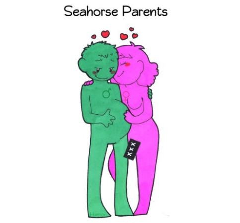 在海馬的世界裡,雌海馬擁有像陰莖一樣構造的產卵管,她會將卵產在雄海馬的育兒袋中並在裡面與精子受精,所以說懷孕的總是爸爸們。目前認為海馬演化出這樣的繁殖策略有兩個好處,雄海馬可以保護卵,雌海馬可以保存更多精力產下更多卵。因此,當小海馬們一個個從育兒袋中鑽出後,很快的,雙親就會再次交配。