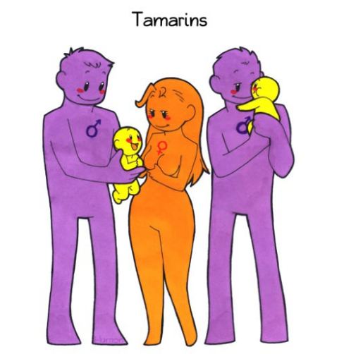 這其實相當合理,因為雌獠狨通常會產下一對雙胞胎寶寶,並且由雄性負責照顧幼仔,只有當餵奶時才會到雌獠狨手上。隨身攜帶一隻小獠狨是非常吃重的工作,科學家甚至發現,當雌獠狨懷孕時,雄獠狨的肌肉重量增加了不少以打理接下來的育幼動作。所以說兩雄一雌的家庭型式有助於寶寶的存活(兩個男人各帶一個寶寶),相較之下,一雄配二雌的家庭反而要使一個大男人需要帶四個小寶寶。
