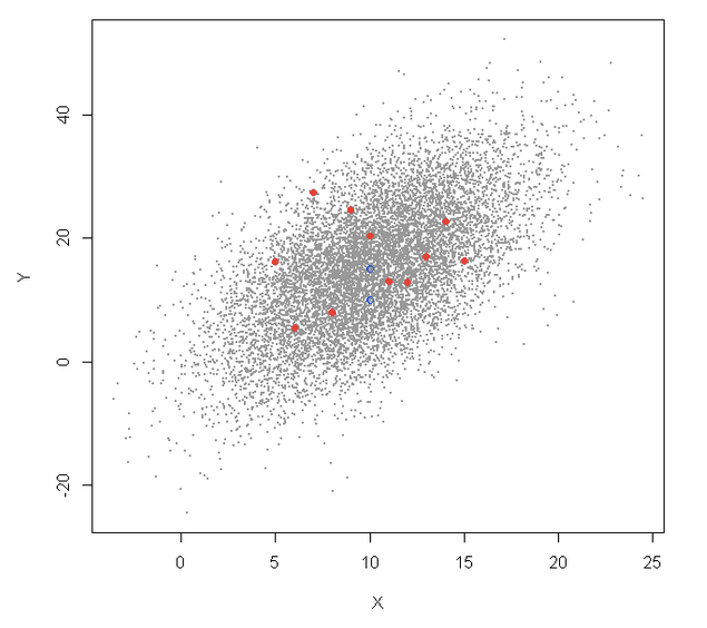 de Groot 判斷心理科學的研究能分為假設探索型(hypothesis exploratory)與假設檢驗型(hypothesis testing)兩種。以下圖為例說明,設定某種研究題材的獨變項(X)與依變項(Y)可能產生10,000種實驗結果,分佈以灰點表示。若你知道迴歸分析,會了解不論挑選那一個獨變項數值做為實驗條件,最有可能發現的結果會接近依變項的迴歸平均數,例如以獨變項的平均值 10 進行實驗,最有可能的依變項數值是 15,代表這個研究題材要找到的最終目標。如果這個題材是剛開始有人進行研究,資料還不夠推測最有可能的迴歸關係,進行假設探索型的研究的目標就是儘可能嘗試多種獨變項條件,測量最有可能的結果是什麼?就像下圖的紅色實心點是模擬對 11 種獨變項條件進行實驗,得到的 11 種結果。如果這個題材的資料已經很充分,有理論或假設讓研究者能推測針對某種獨變項條件進行實驗,評估最有可能的結果,進行假設檢驗型的研究就是確認這套假設的預測是不是可靠。如同下圖的藍色空心點,都是獨變項為 10 的結果。這個比較可以看出假設檢驗型研究的結論,最接近這個系列的最終目標:獨變項與依變項的總平均。(註:所謂「迴歸至平均」是也。)