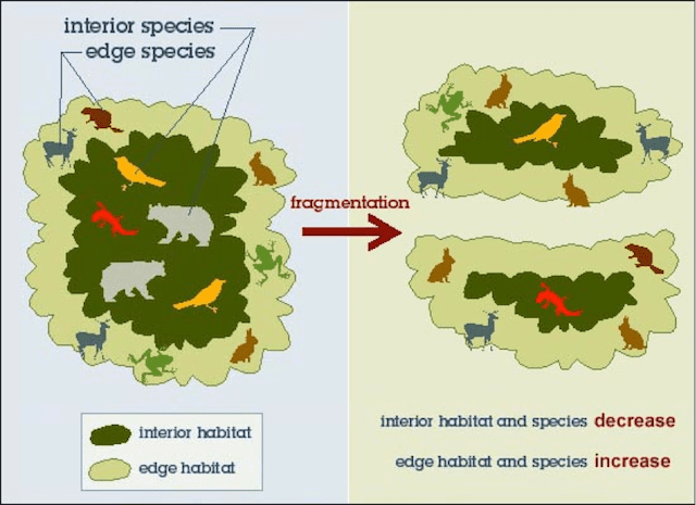 一條道路使棲地面積縮減為兩個面積為二分之一的小塊;十字交會的道路,則將棲地縮減為四個四分之一的更小塊。由原先單一大面積棲地,分裂為眾多小面積棲地的現象,稱為棲地破碎化(habitat fragmentation)。雖然棲地破碎化不一定使棲地面積大幅減少,但是卻使單一大面積棲地的特性完全喪失,大幅強化邊緣效應的負面影響。對內部物種造成極大的威脅,使其就地滅絕(extirpate)的風險提高。除此之外,小面積棲地所能容納的族群量及物種數相當有限[10],更隔離了各棲地區塊之間族群與基因的交流[8]。棲地破碎化的負面效應已經使其成為生物多樣性流失的主要元兇之一[8, 11]。