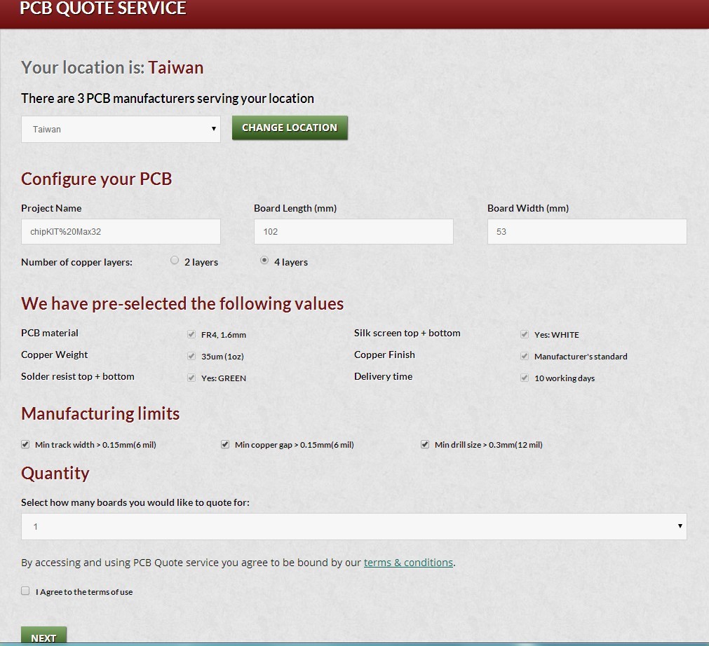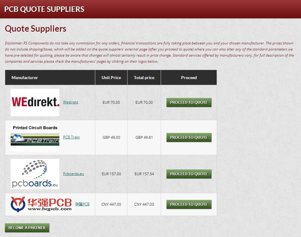 當PCB 板完成設計後, 所用的零件要去哪裡購買呢? DesignSparkPCB 除了可輸出製作PCB 板所需的gerber 檔外, 還可匯出在設計上所使用到的物料清單表( 圖3)。依照過往的慣例工程師都需要自行聯繫元件廠商,以確認電路板上所用元件的庫存及供貨狀況, 現在只要連上DesignSpark PCB 內的線上目錄,選擇所在地區並創立帳號之後,就可看到RS 的元件庫存資料以及報價,將有庫存(或符合金額)的元件放入設計檔中,進而避免因元件無庫存使得設計完成後,拖延到電路板整體完工的時間。同時,也可在網站上執行電路板實體輸出的動作(圖4),而RS會自動替你挑選離你較近的製板廠商來提供報價與製作的服務(圖5)。