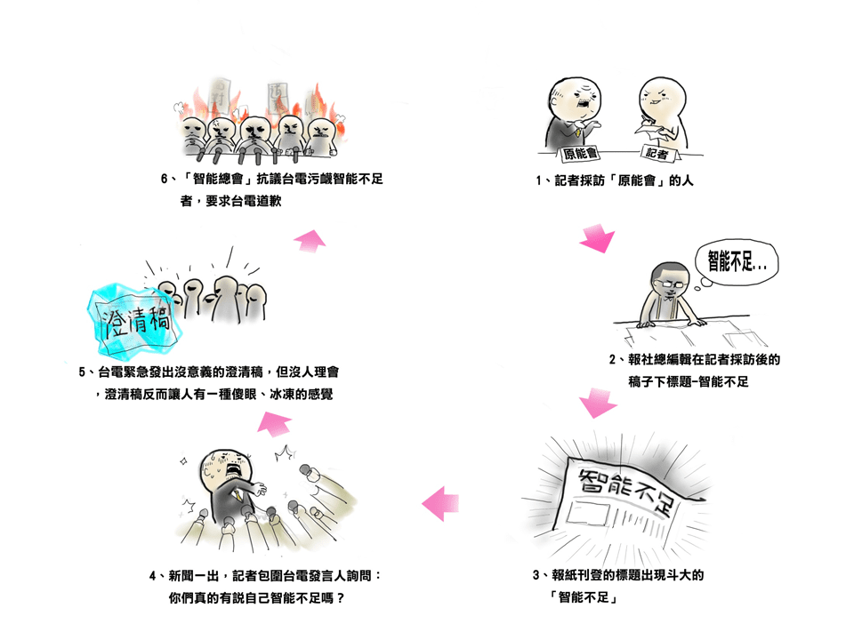 這一整個荒謬的過程,推測就像下圖所示:首先是記者在採訪原能會的過程中,不經意地記錄到這一段「智能不足」的轉述,至於究竟是誰說的?是不是這樣說?在哪一種情境下?…根本已經不可考證。之後,當記者寫好稿件送上編輯台時,在當時的社會氛圍下,台電的「智能不足」有可能成為一個很好的新聞賣點,也因此獲得了編輯台的青睞,斗大的「台電:我們智能不足」躍上版面標題。新聞一出,台電立即成為眾矢之的,科技背景的發言人如何是這些嗜血媒體的對手呢?幾近急凍的新聞稿,更救不了正火燙的發燒議題。最後這事件就在「中華民國智障者家長總會」的撻伐聲中逐漸落幕。