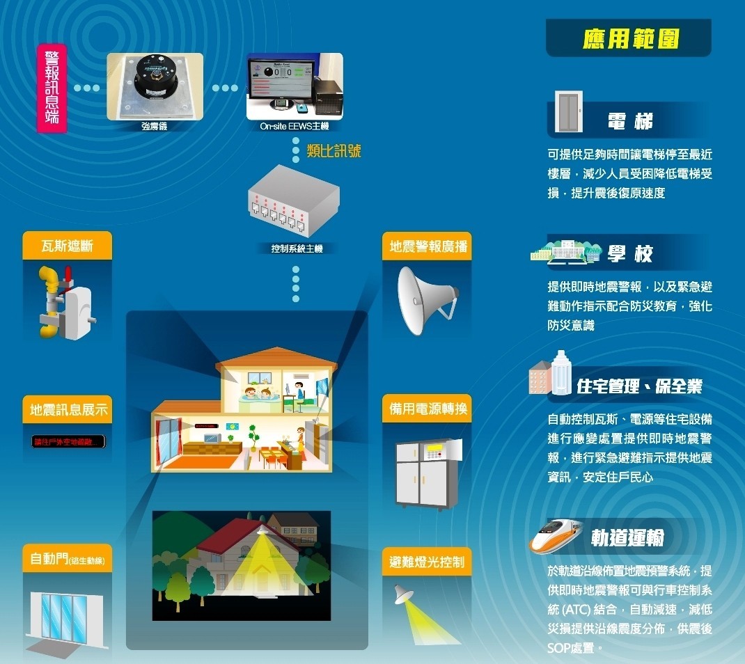 當地震警報發出,要在短短的黃金數秒內,自動以廣播、電視、簡訊等方式讓民眾收到地震訊息,並能自動關閉瓦斯、停妥電梯並開門、指引逃生動線、高鐵與捷運減速、核電廠停機等等減災措施。